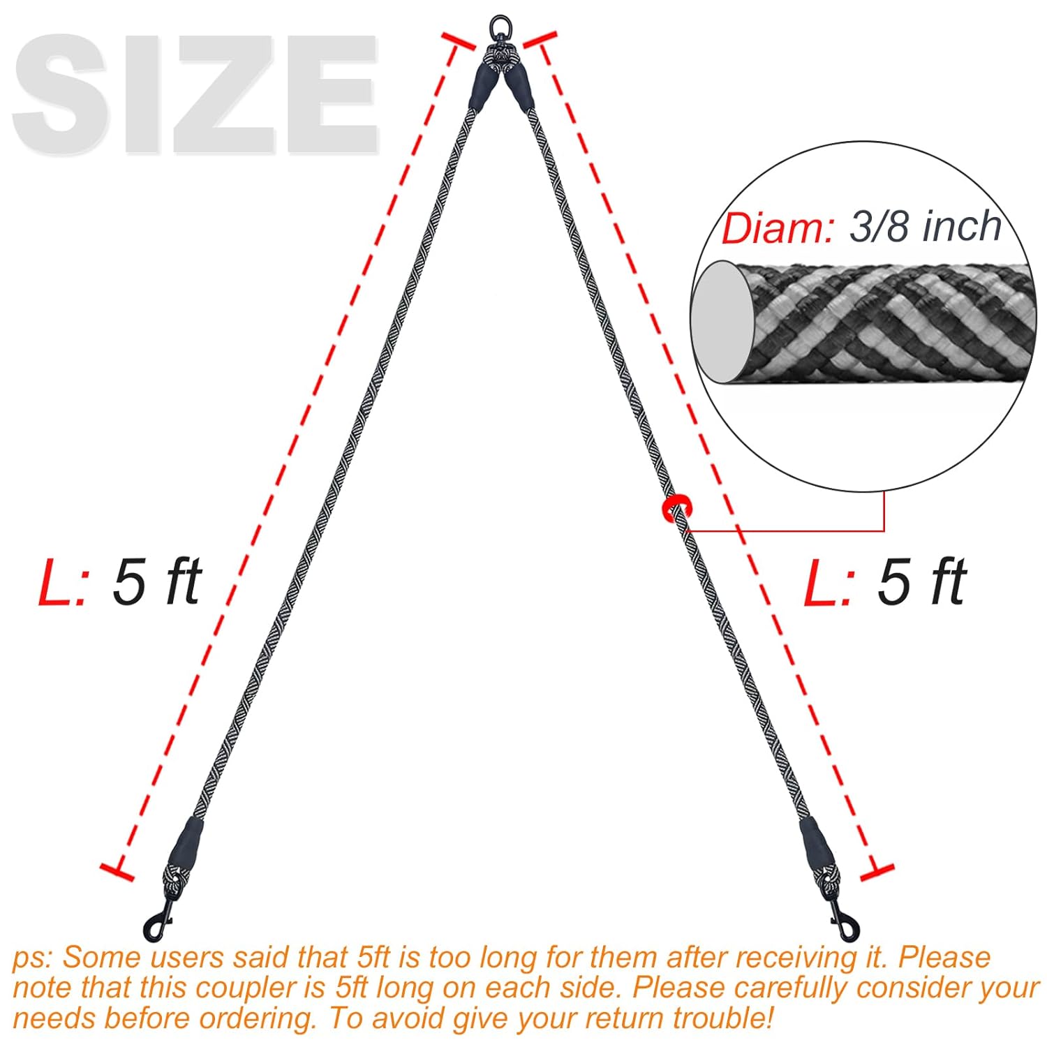 - The 5ft double leash coupler it gives each dog plenty of space to roam in different directions. This dual dog leash makes walking 2 dogs a breeze, you can easily take a walk with your two dogs, a definite must have for any multi dog home