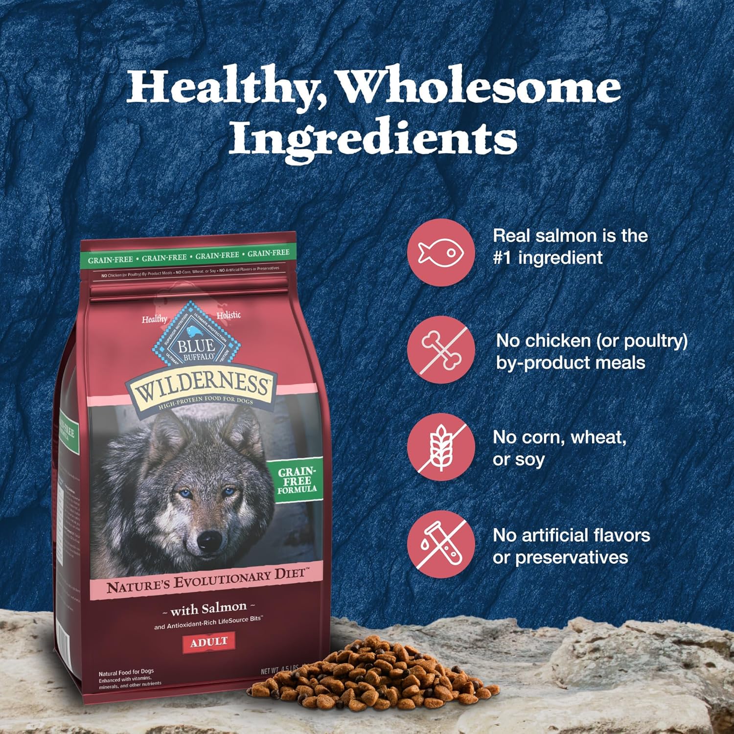 - CONTAINS: One (1) 13-lb bag of BLUE Wilderness Adult High-Protein Dry Dog Food with Real Salmon, Grain-Free, Made in the USA with Natural Ingredients, Salmon