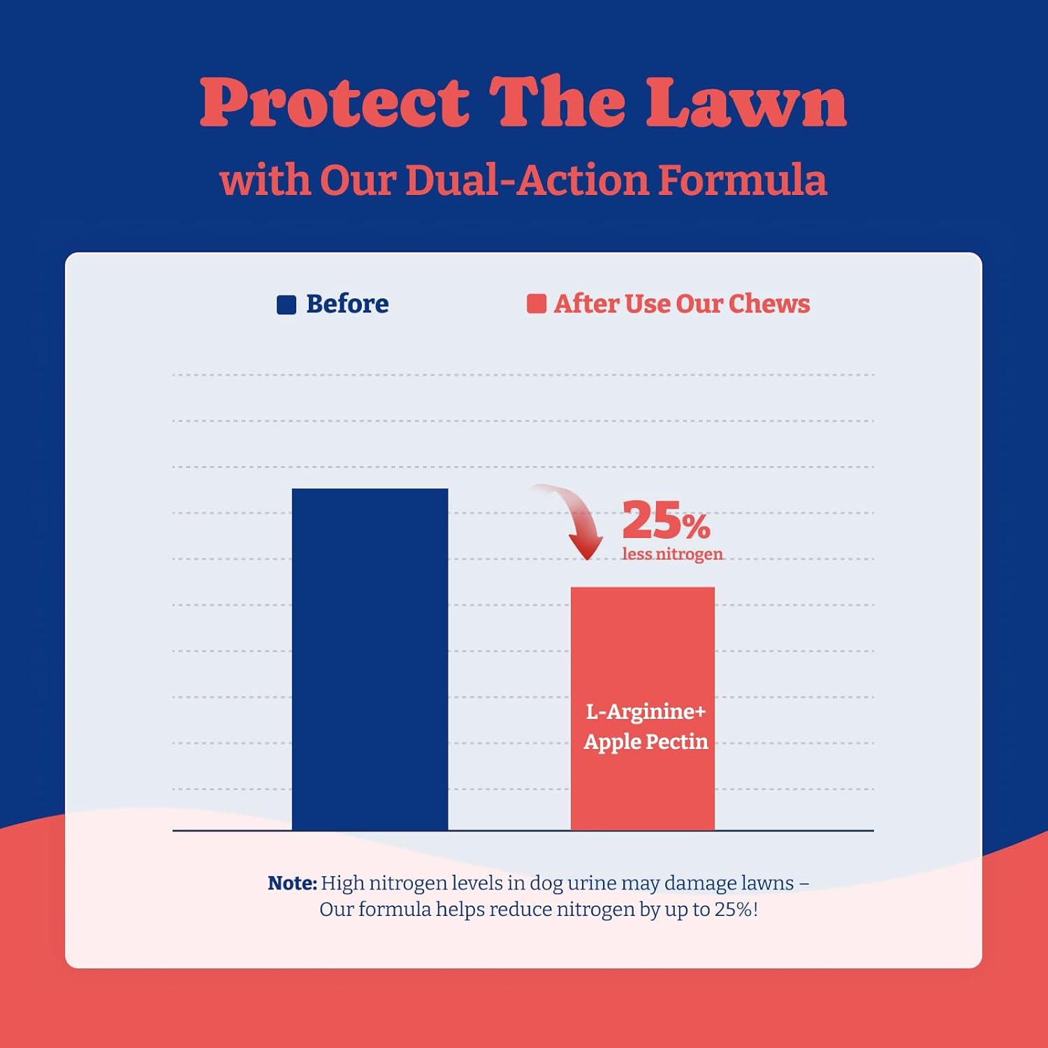 - Helps Maintain a Healthy Lawn: High nitrogen levels in dog urine can cause yellow spots on your grass. Our lawn burn spot chews with L-Arginine & Apple Pectin is designed to help reduce nitrogen levels by up to 25%, and grass green dog chews keeps the grass green and healthy. Grass savers for dog urine keeps your dog healthy and lawn green.