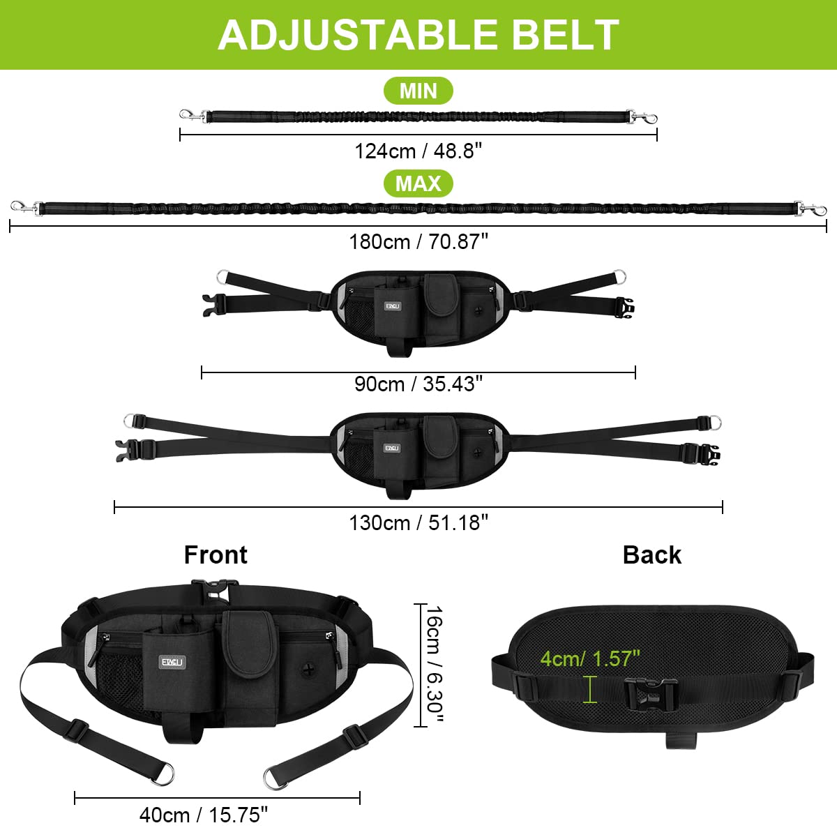 - 【Adequate Running Room for Dog】 The belt leash for dog walking has a ton of elasticity and it can adjust from 124cm(48.8″)to 180cm(70.87″), can withstand tensions up to 50kg easily; while the waist belt is adjustable from 90cm(35.43″)to 130cm(51.18″) to various waist sizes.