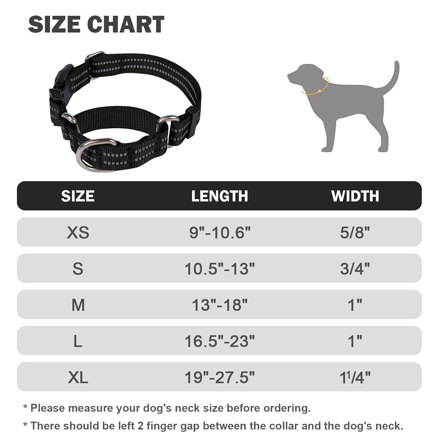 - 【Size】Please make sure to leave only 2 fingers between the collar and dog neck. Refer to the chart choose a size that can slip over the head, properly fitting collar won’t leave any room for your dog to chew and pet won’t slip out of the collar