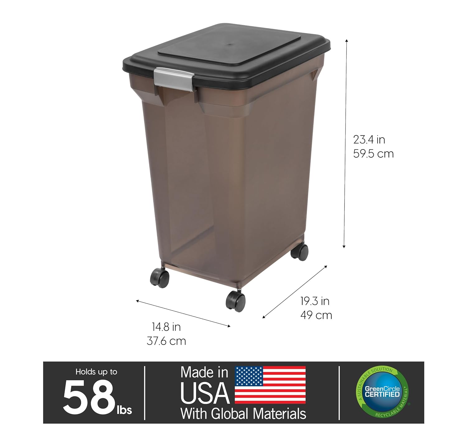 - FOOD FOR ALL: For your cats, dogs, birds, and more. Store your pet’s dry foods into sealable and portable pet food container. 67 Qt size food storage container is great for storing around 58 Lb of dry food (capacity depends on the kind of food you store)