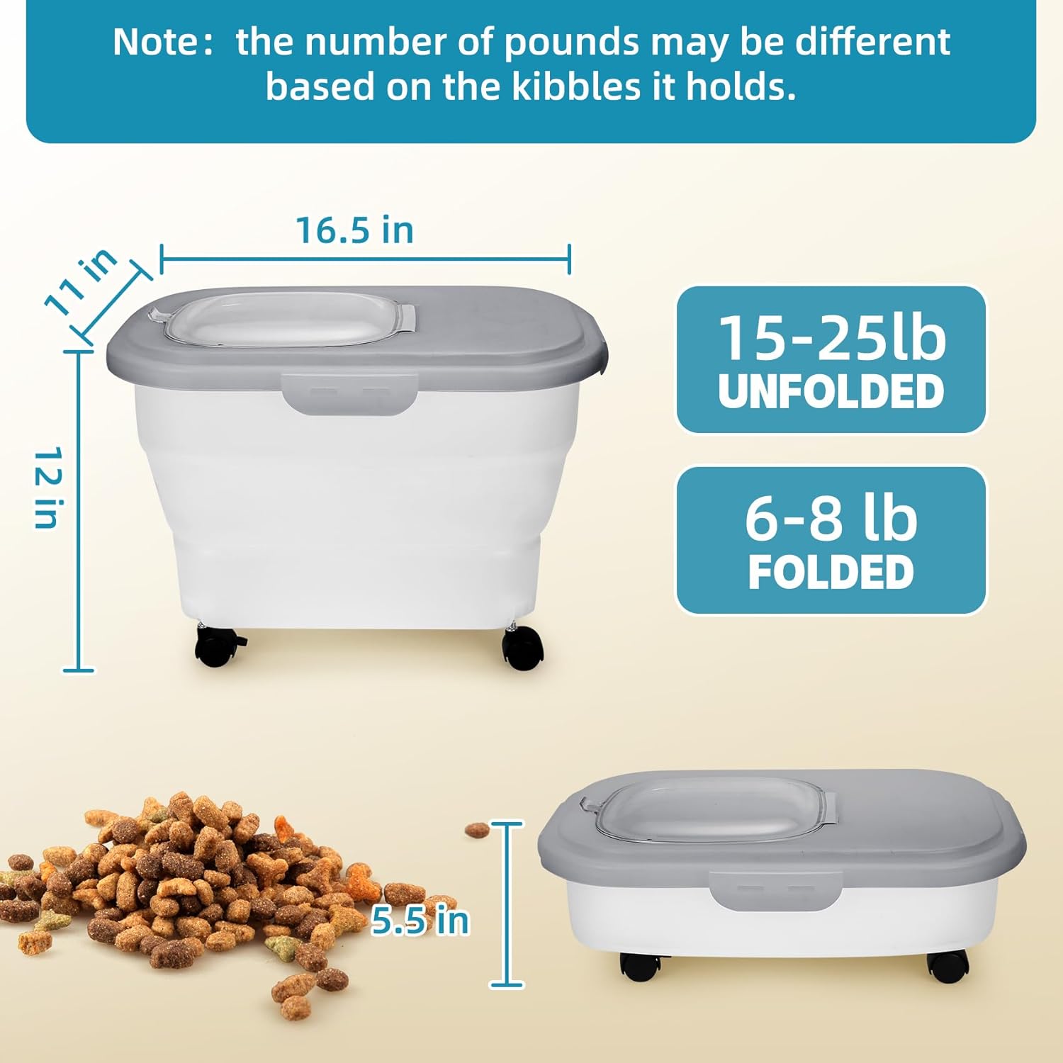 - 🐱【Collapsible to Save Space】: It’s your choice to make the cat food storage container small or large. The expanded size is 16.5in * 11in * 12in, can hold 15-25lb dog/cat dry food, and the folded size is 16.5in * 11in * 5.5in, can hold 6-8lb depand on the cereals it hold. When the dog food holder is half empty can collapse the container down for space saving, and also convenient for taking for travel.