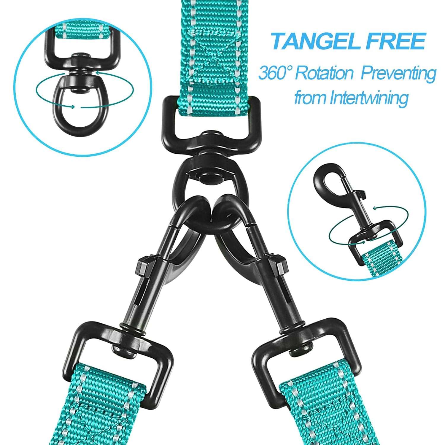 - No Tangle Double Dog Leash: 360° swivel clasps help to keep your dogs from getting tangled together. No need to worry about getting twisted two dog leash when dogs switch sides