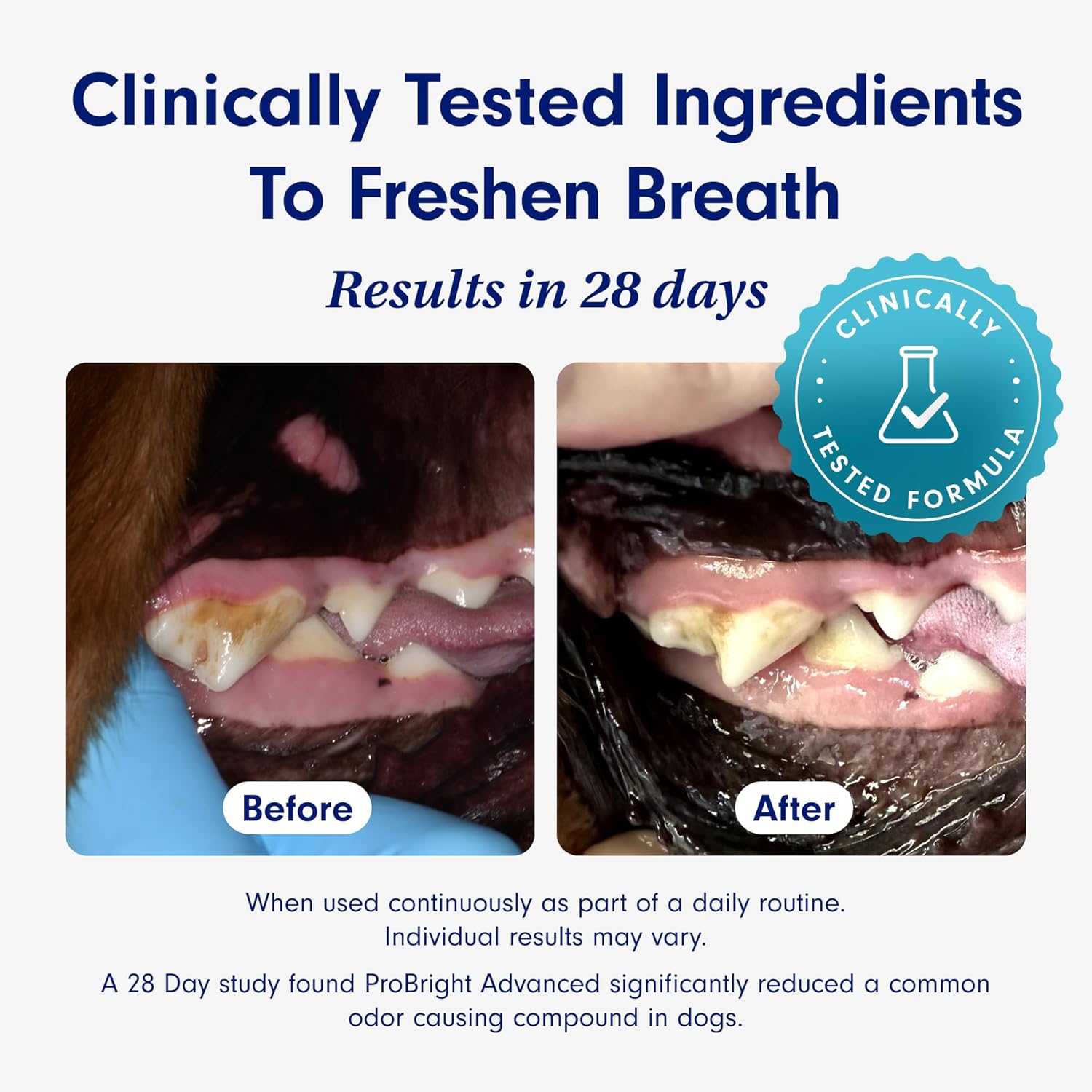 - Award-Winning, Clinically Tested* Formula – ProBright Advanced is the dog dental care product of the year—now with a new flavor, superior ingredients, and a clinically tested formula. In just 28 days, daily use was shown to significantly reduce bad breath–causing compounds. Say goodbye to toothpaste, brushing battles, and dental sticks. Say hello to ProBright—advanced, effortless oral care at its best