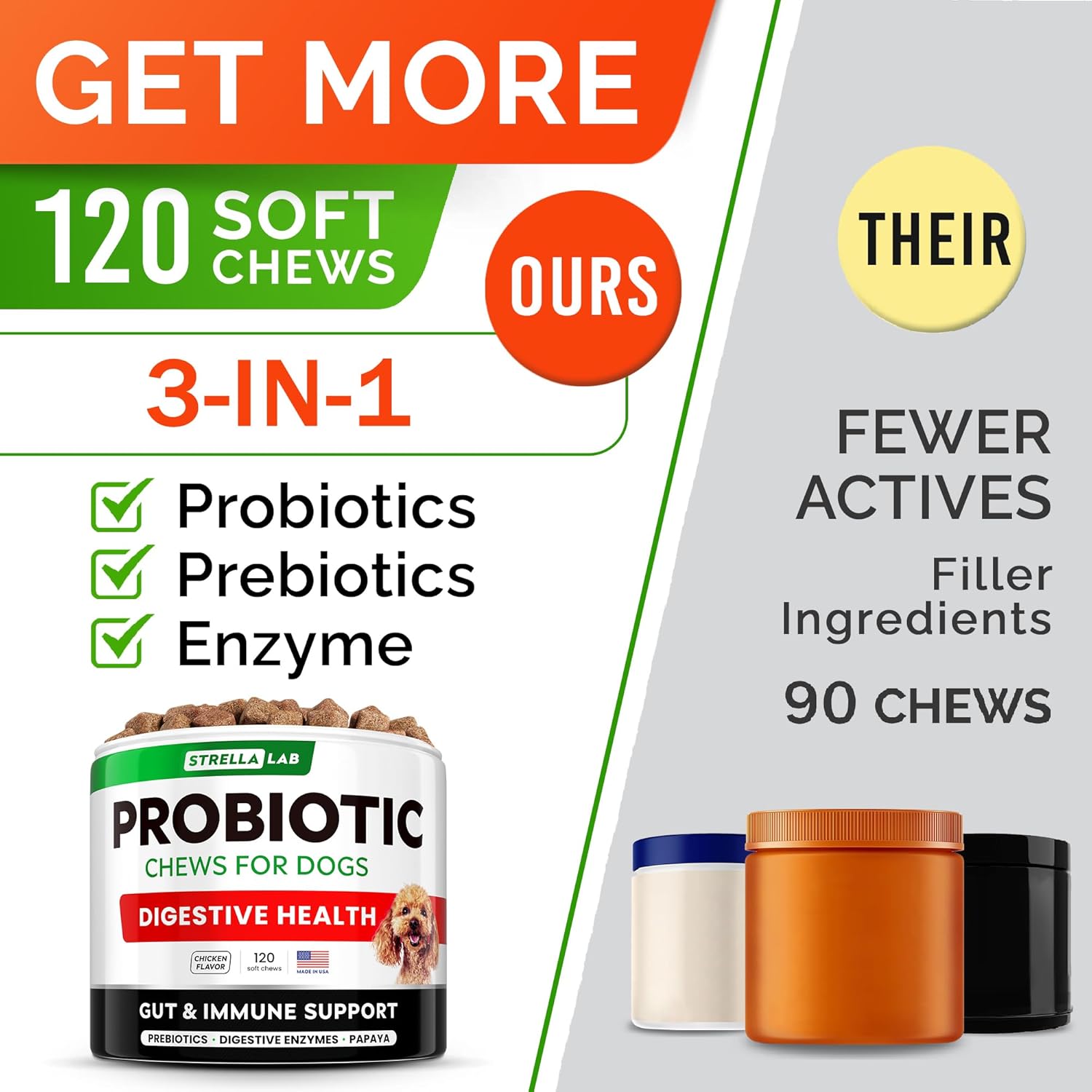 - GREAT VALUE – 120 CHEWS PER JAR – you’ll get a huge jar with 120 probiotic bites, that will provide up to 3 month supply of premium chewable treats. Made in USA our product has no soy, no corn, no dairy or sugar.